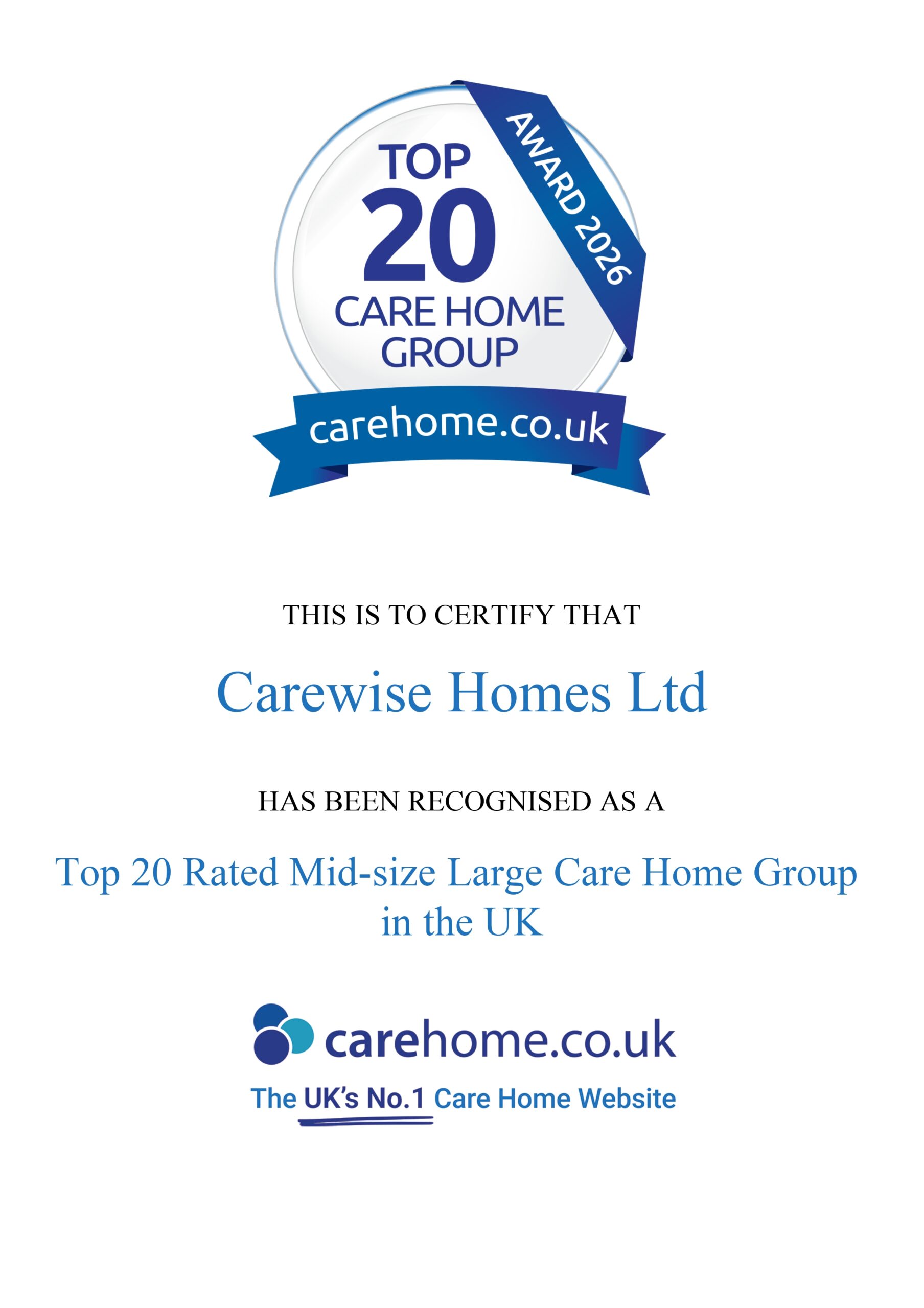 • Carewise Homes Ltd carehome.co.uk Top 20 Mid-size Large Care Home Groups 2026 Winner Badge